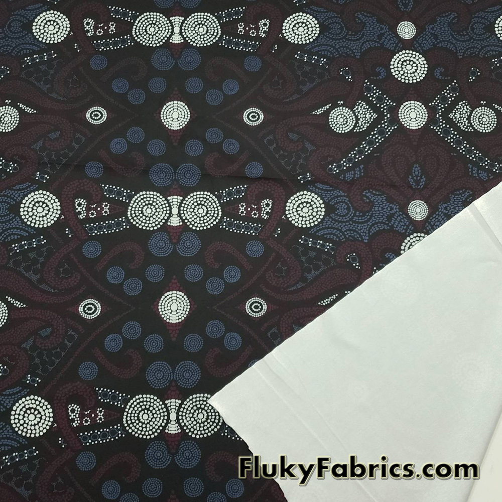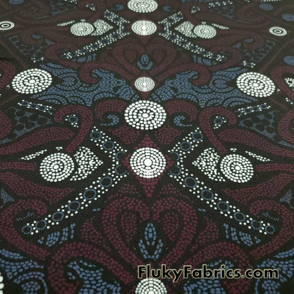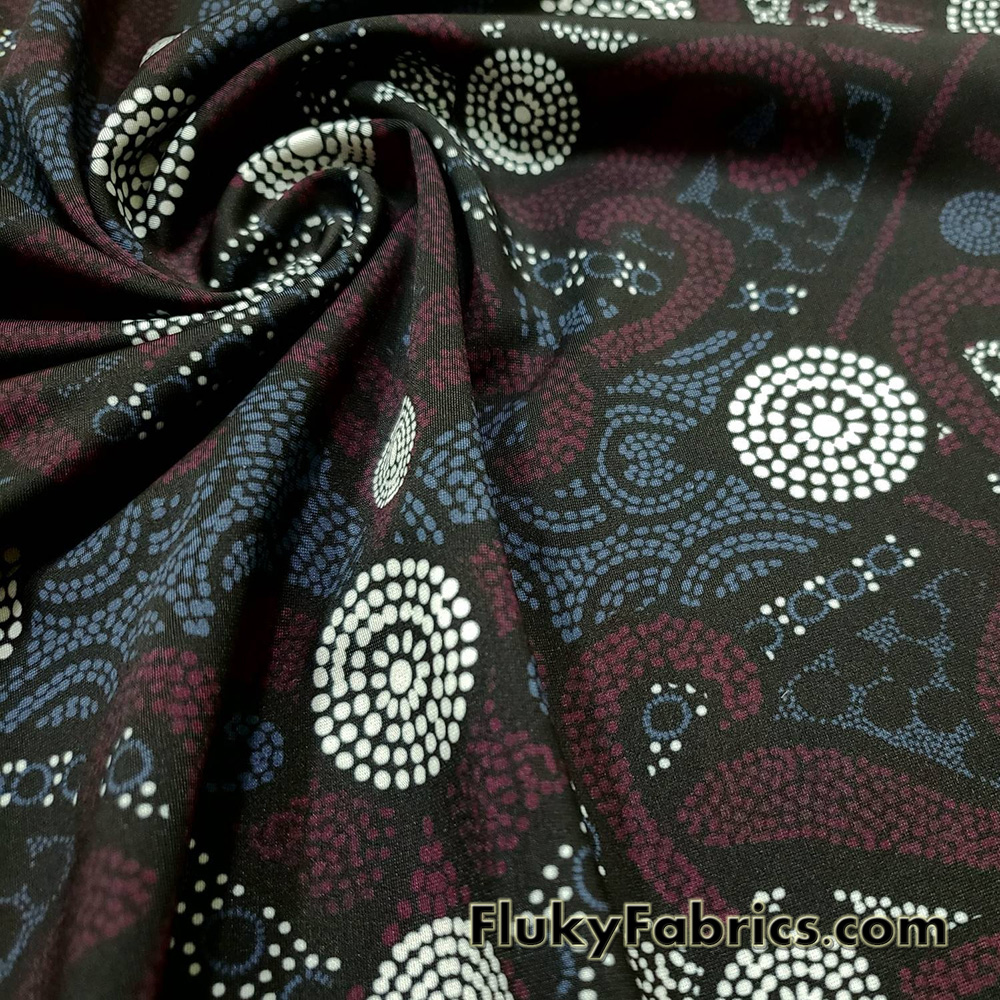 - Beautiful shapes in blue, burgundy and white dots over a black background 4-way stretch light to med weight opaque nylon spandex.
