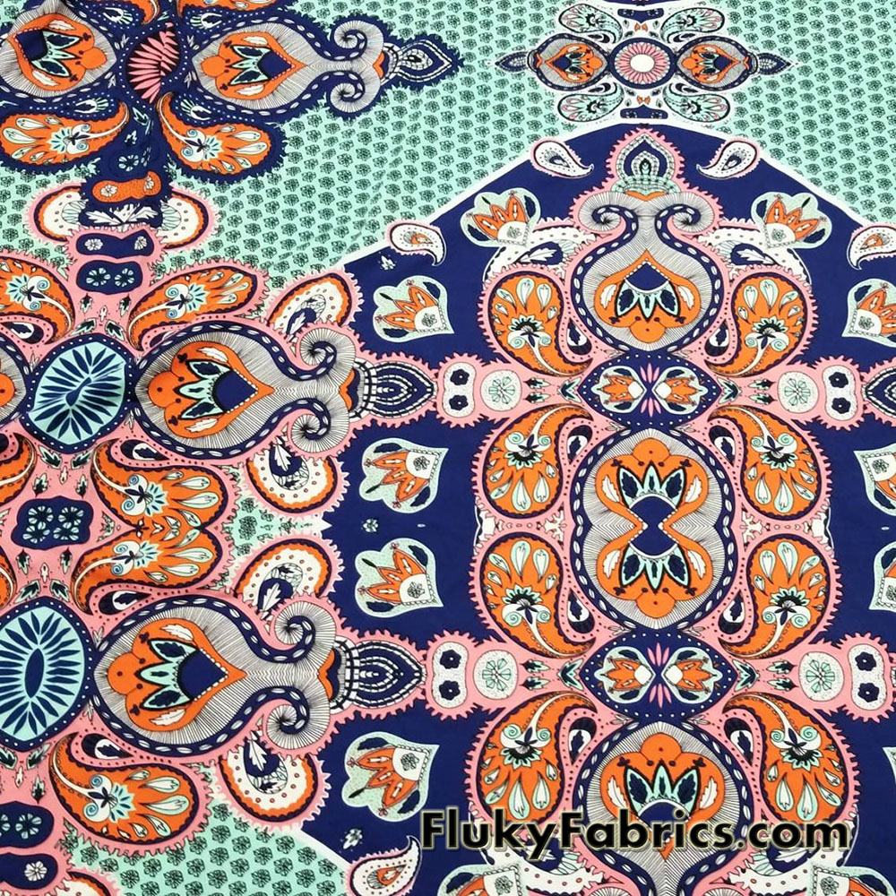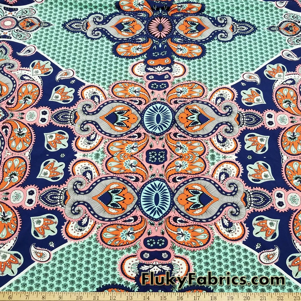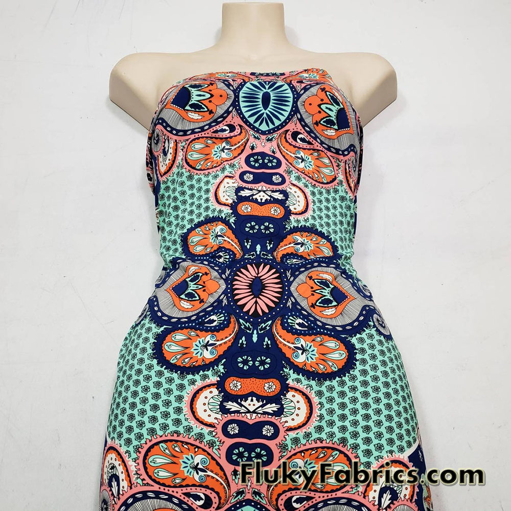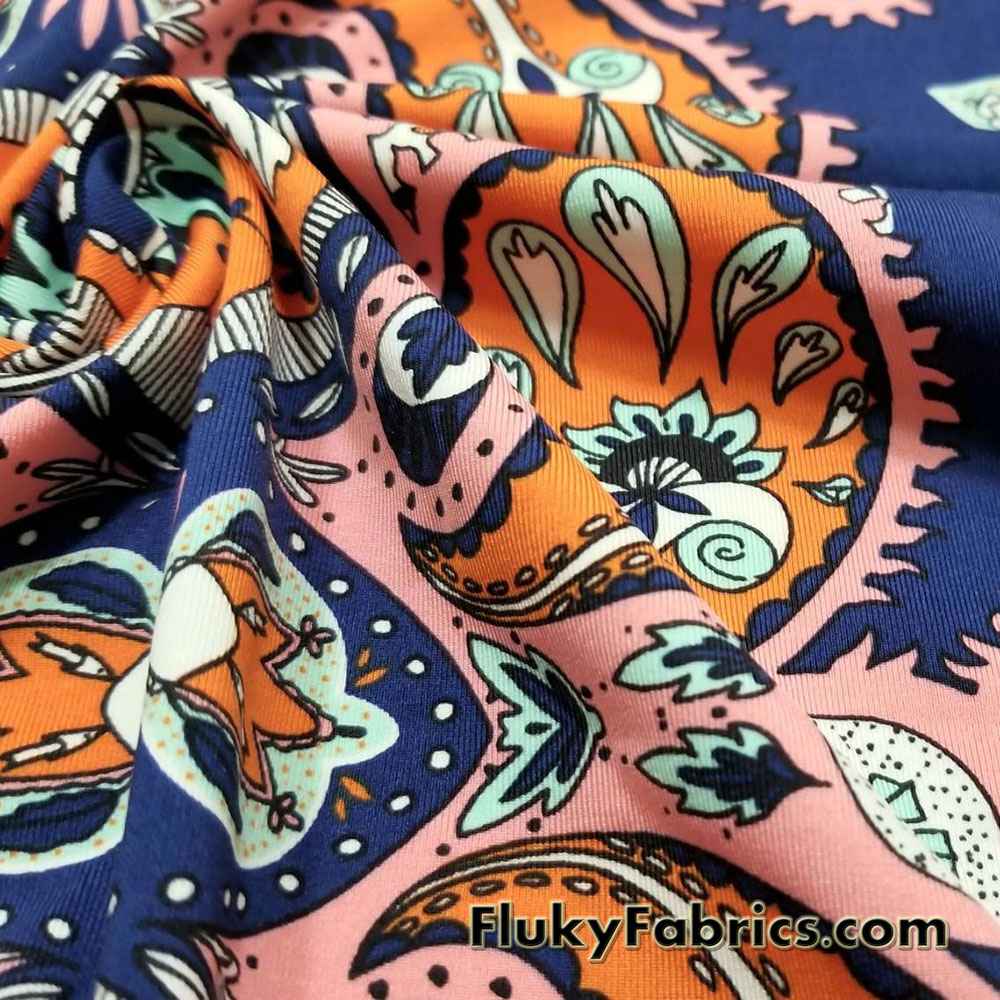 Big abstract paisleys and flowers print 4-way stretch light to med weight opaque nylon spandex swimsuit fabric.