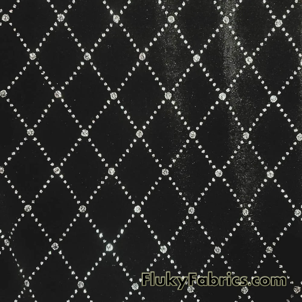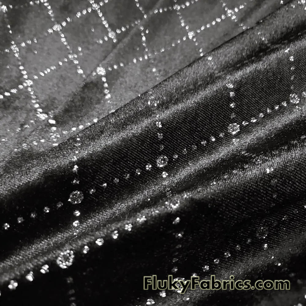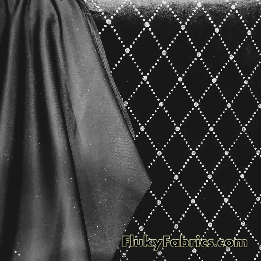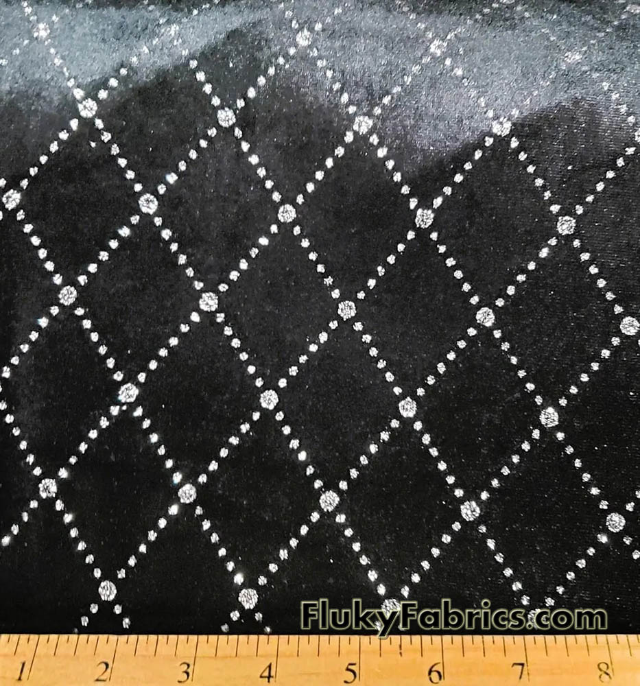 Black velvet fabric featuring a shimmering silver glitter geometric rhomboid (argyle-style) pattern. The rich velvet base adds depth and luxury, while the glittered design catches the light for a dramatic, eye-catching effect.