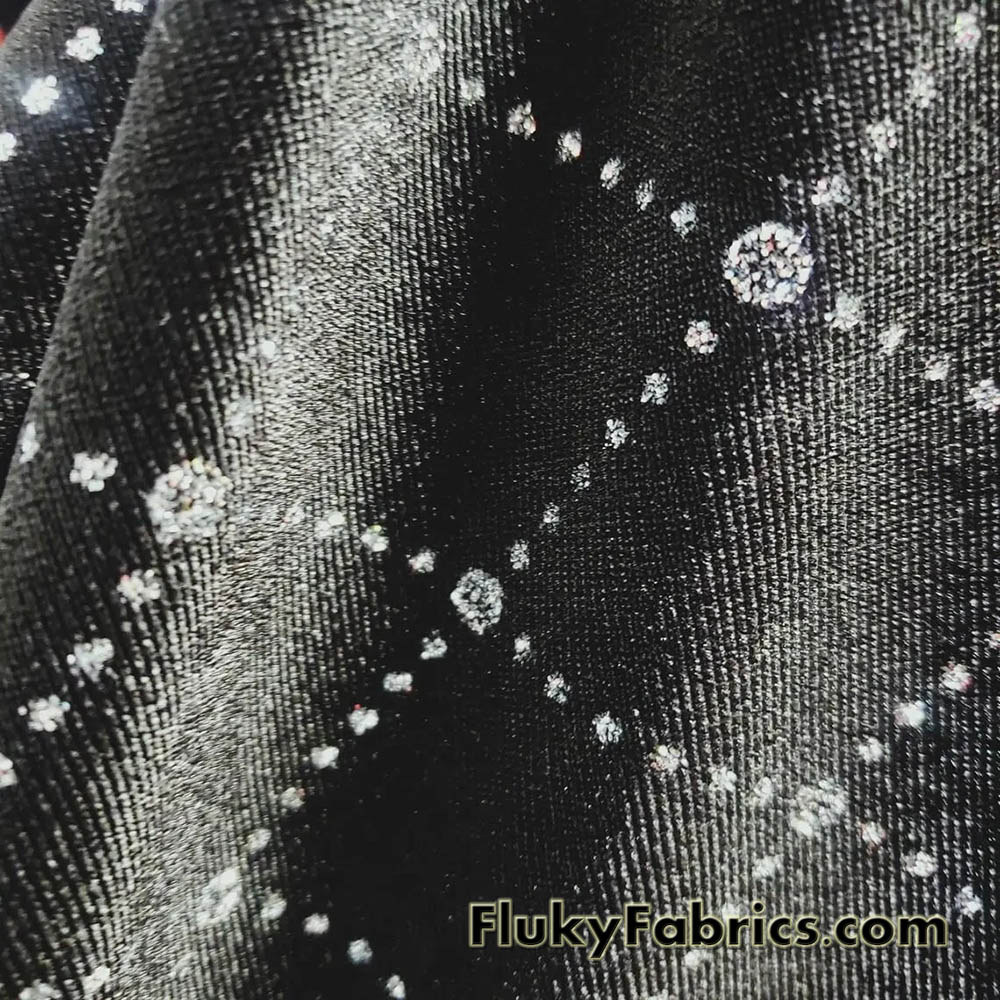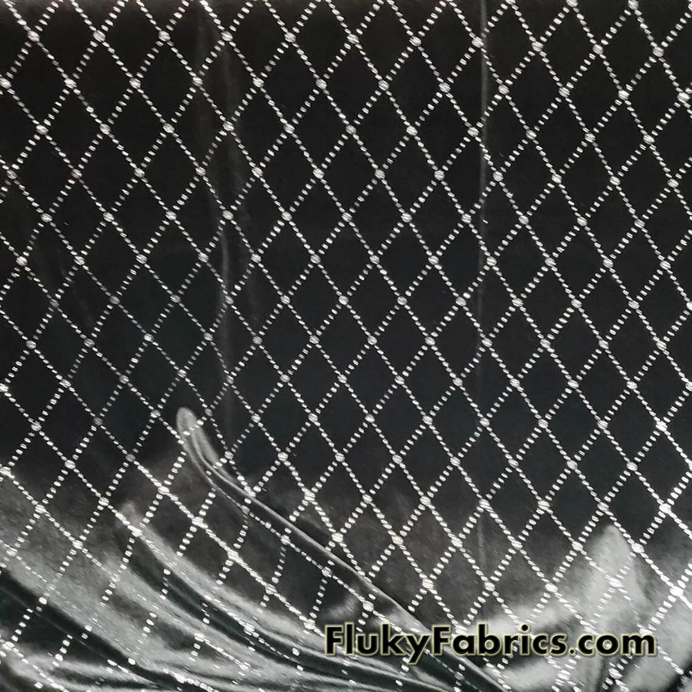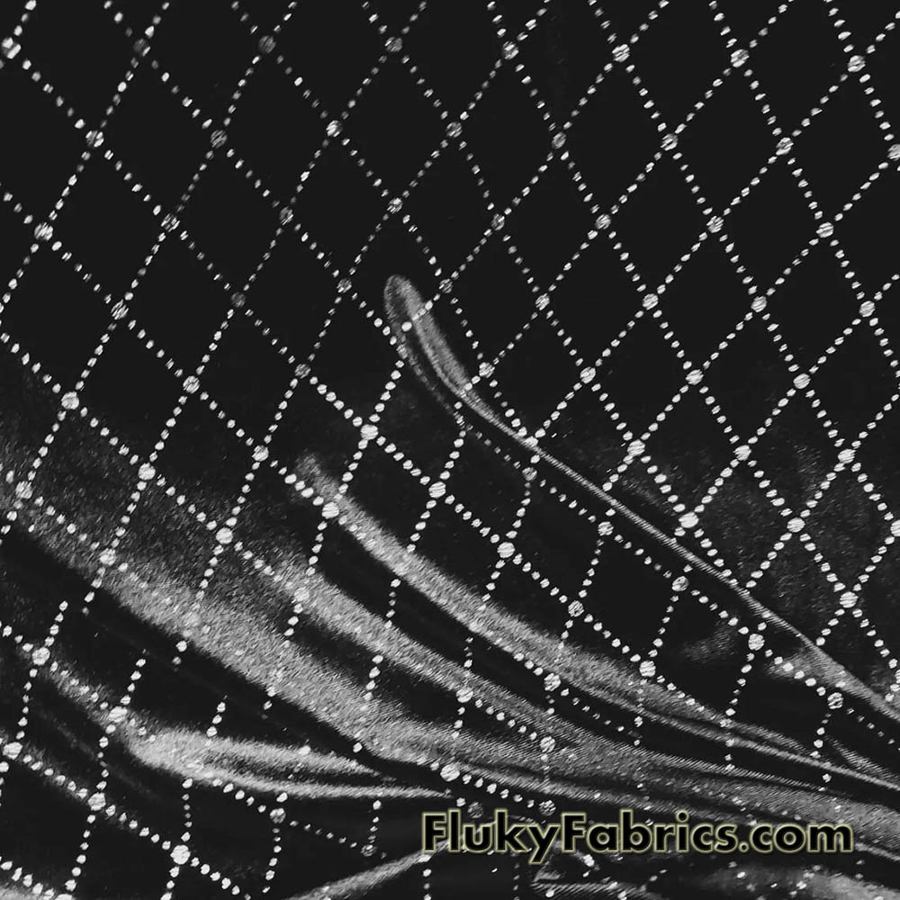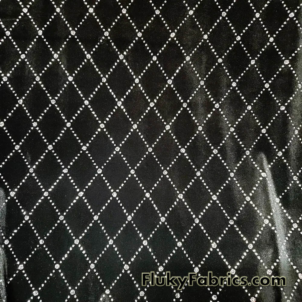 Black velvet fabric featuring a shimmering silver glitter geometric rhomboid (argyle-style) pattern. The rich velvet base adds depth and luxury, while the glittered design catches the light for a dramatic, eye-catching effect.