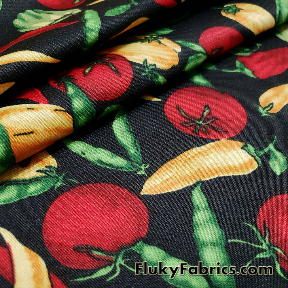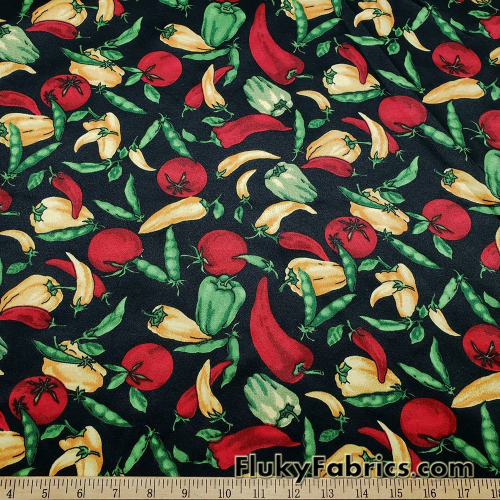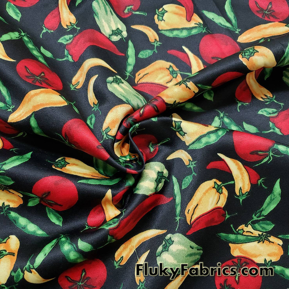 - All over print of yellow chilis, green peppers, red tomatoes and green legumes over a black background light to med weight non-stretch woven fabric