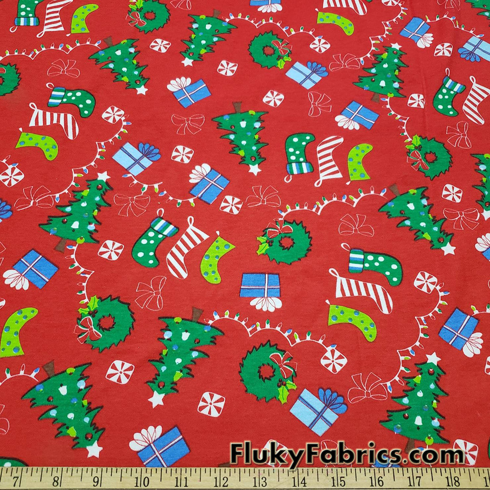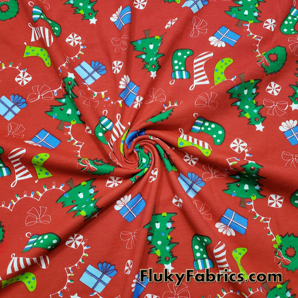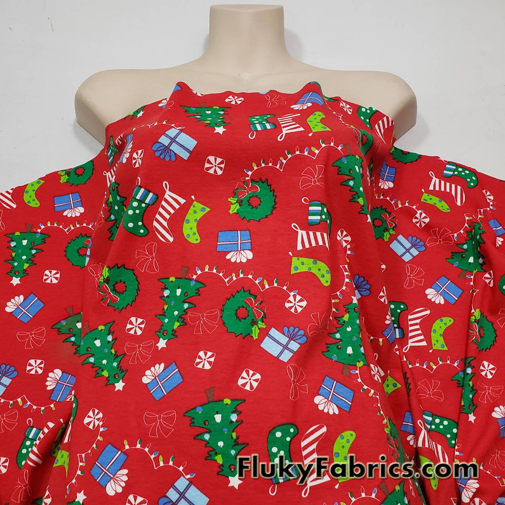 100% cotton non sheer 2-way stretch rib with Christmas motifs print on a red background.