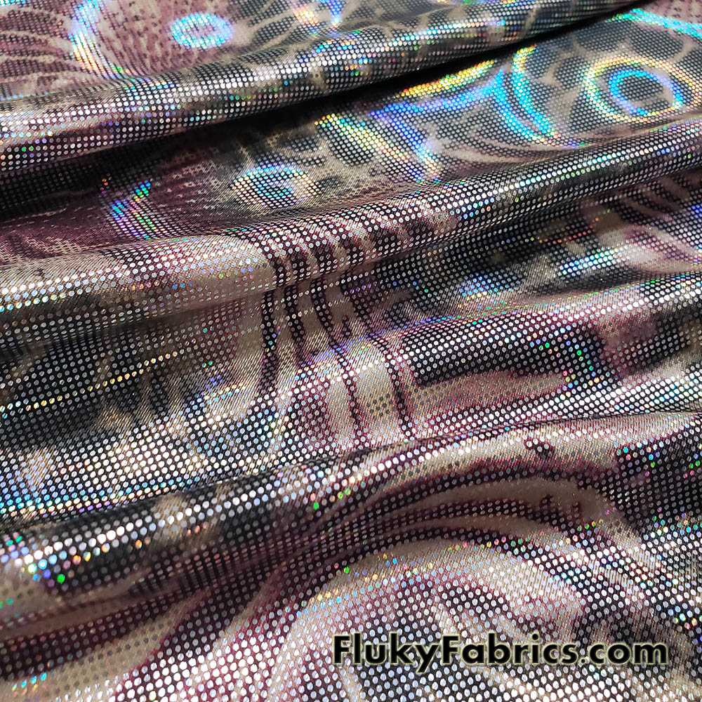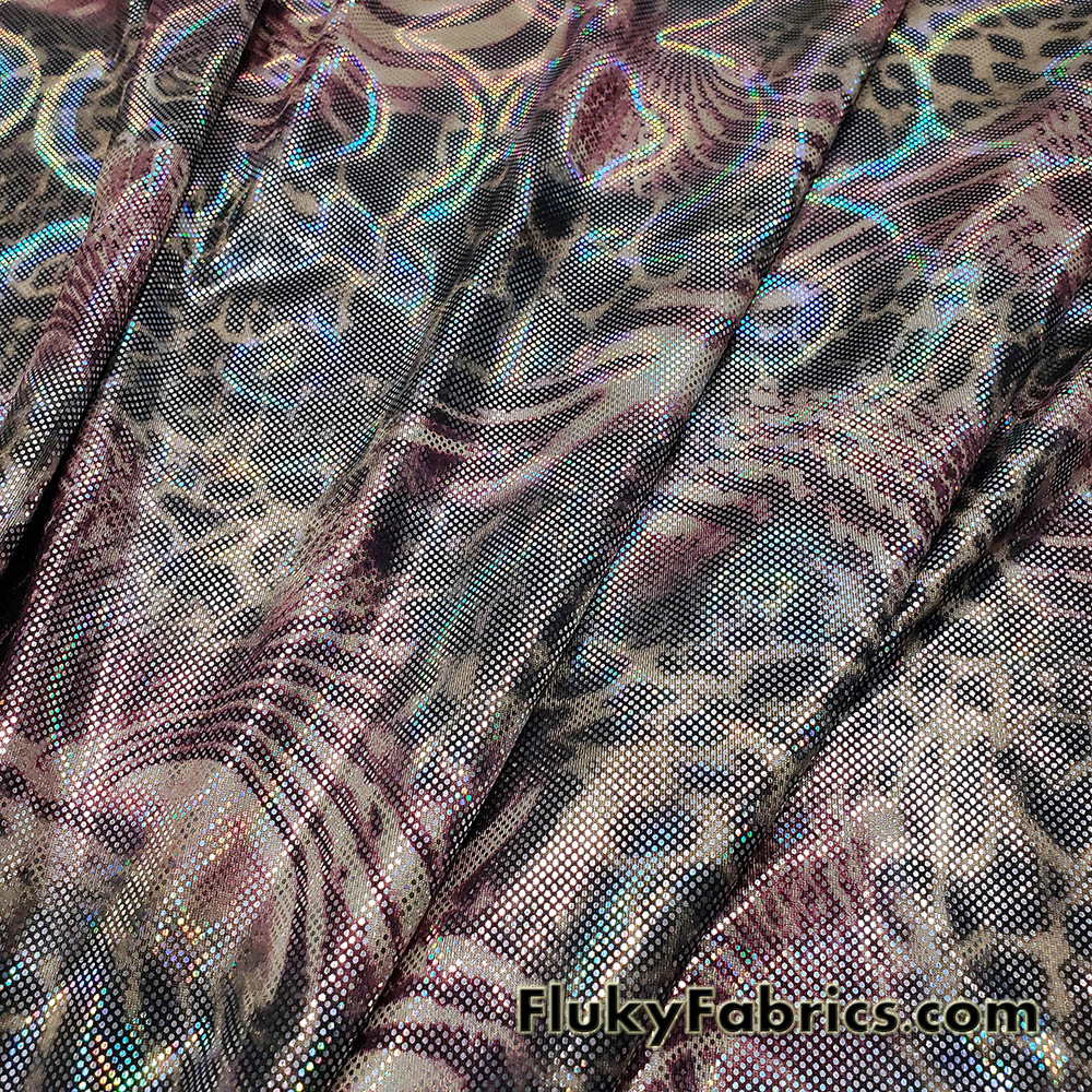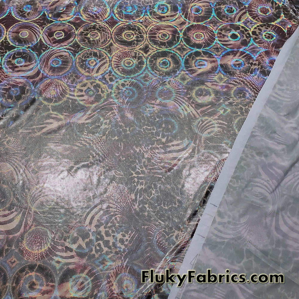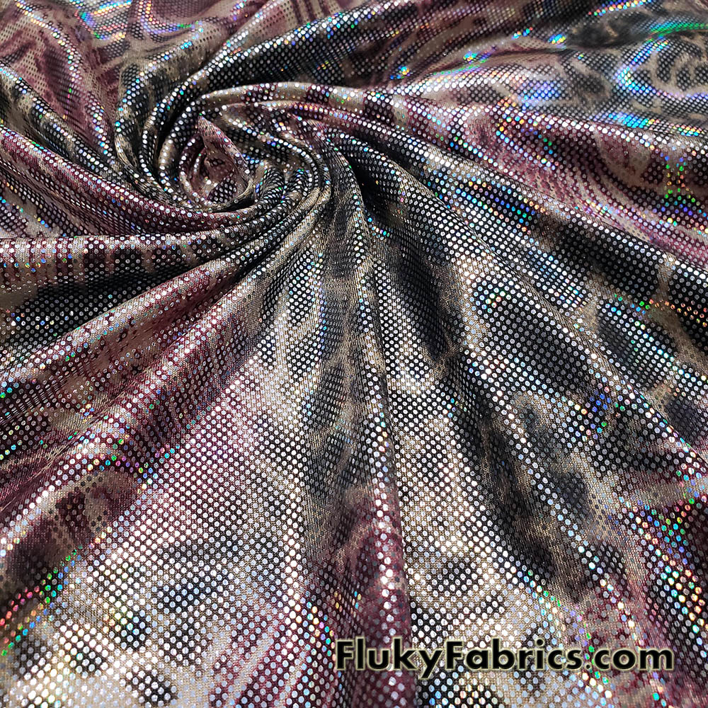 Exotic animal print holographic poly spandex fabric. 2-way stretch fabric features an all-over iridescent dotted foil that creates a mesmerizing optical illusion of circles and diamonds that shimmer, grow, and shift with every move. The result is a magical, color-shifting display that catches the light beautifully from every angle.