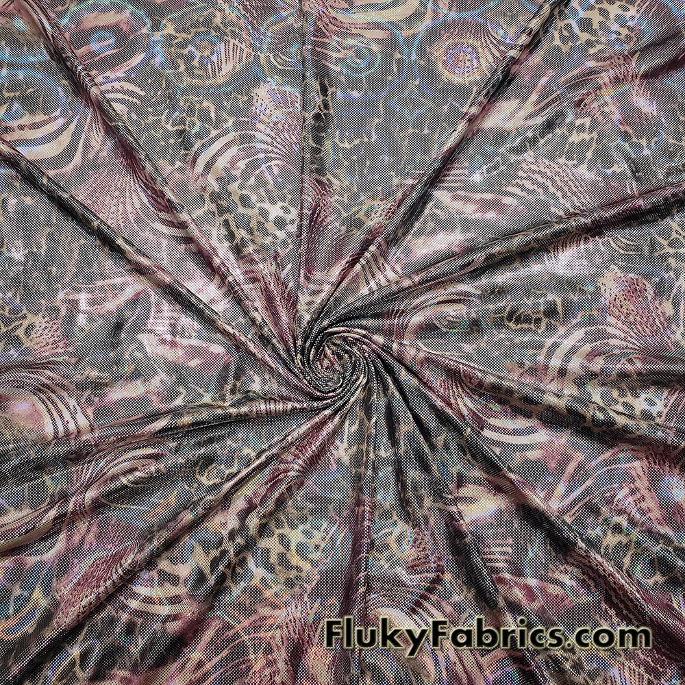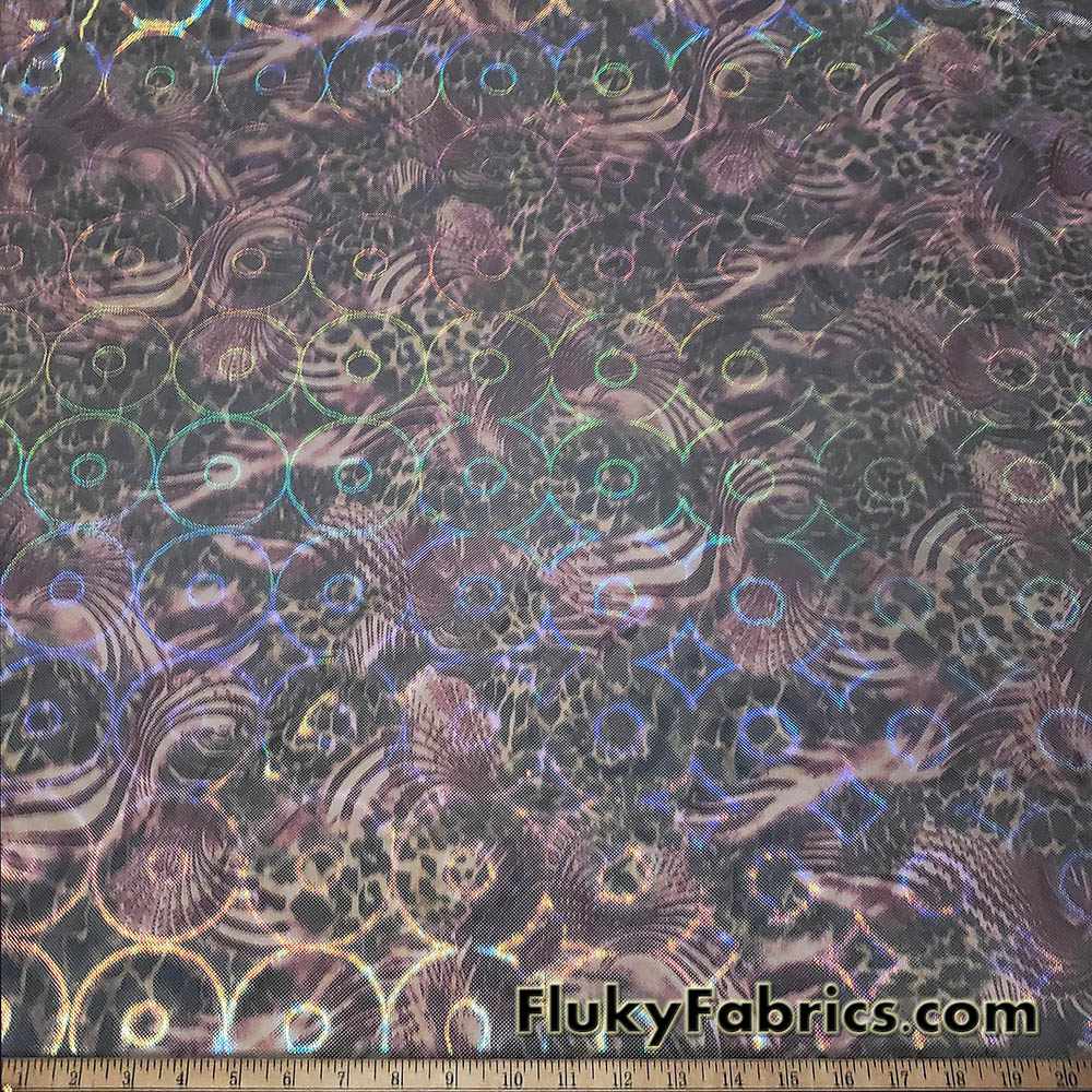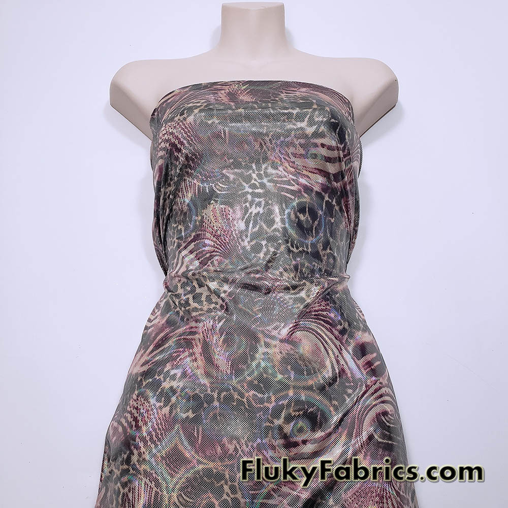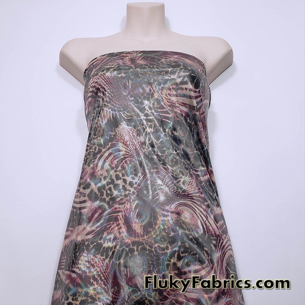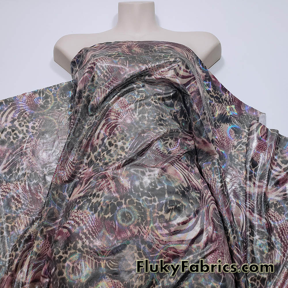 Exotic animal print holographic poly spandex fabric. 2-way stretch fabric features an all-over iridescent dotted foil that creates a mesmerizing optical illusion of circles and diamonds that shimmer, grow, and shift with every move. The result is a magical, color-shifting display that catches the light beautifully from every angle.