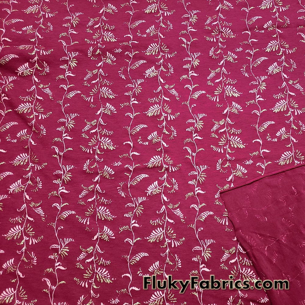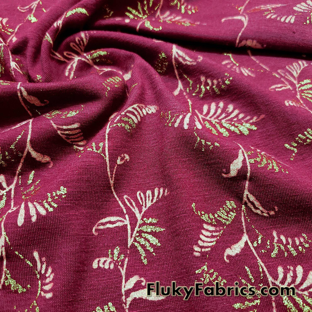 - Pink vines and gold lurex details on the leaves light to med weight soft hand burgundy poly cotton jersey fabric.