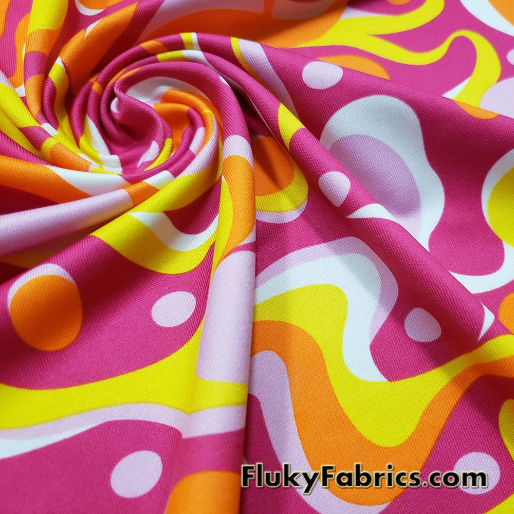 Candy corn psychedelic print in yellow, orange, white, light pink and hot pink poly spandex fabric.