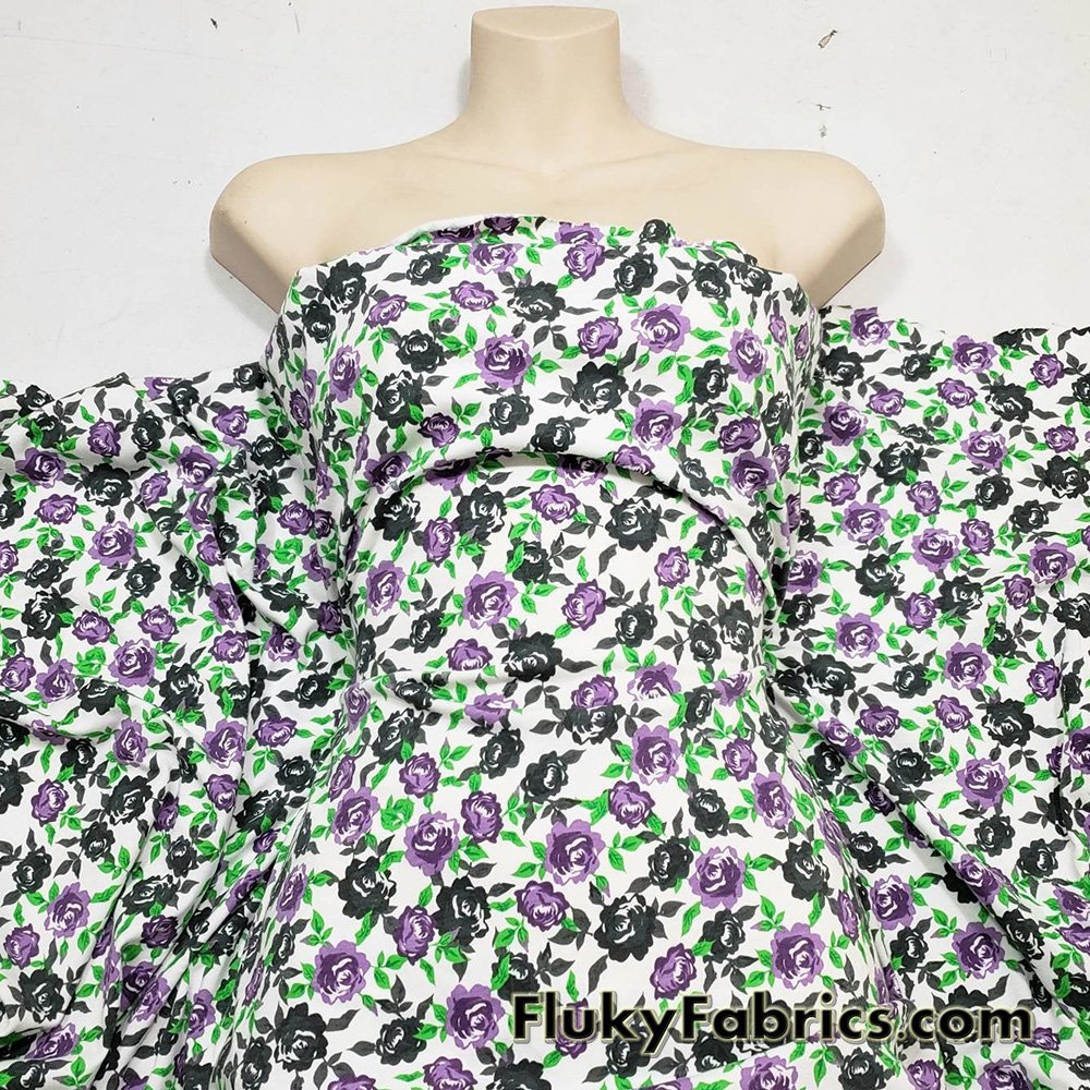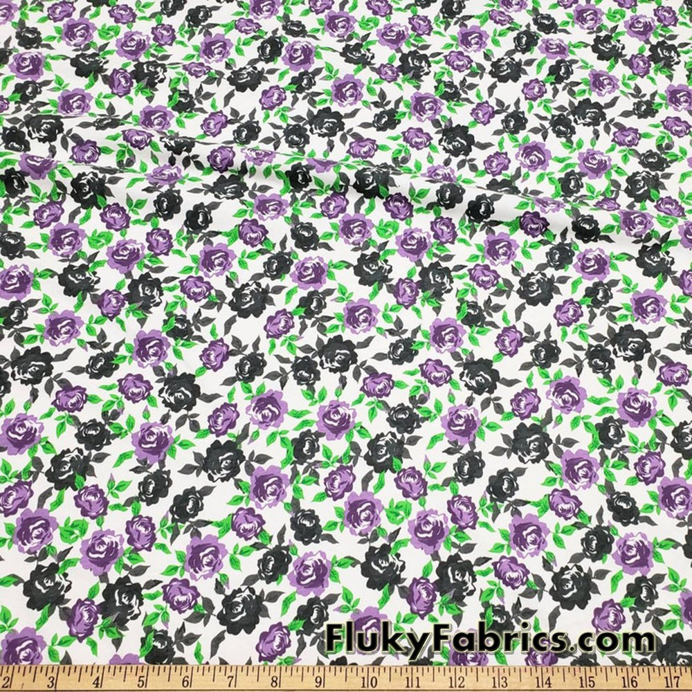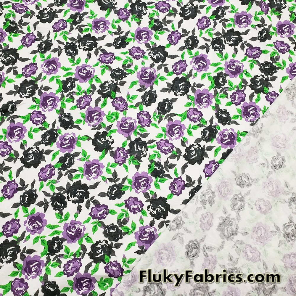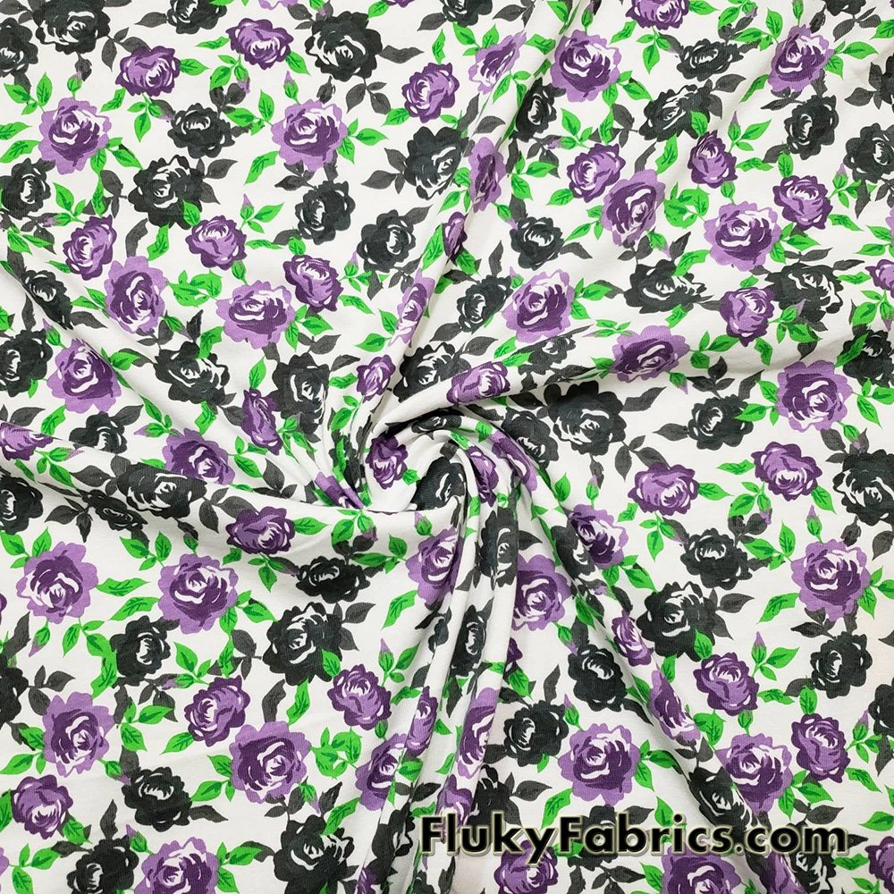 - Purple and charcoal Roses over a white background Cotton jersey spandex light to med weight semi-sheer fabric.