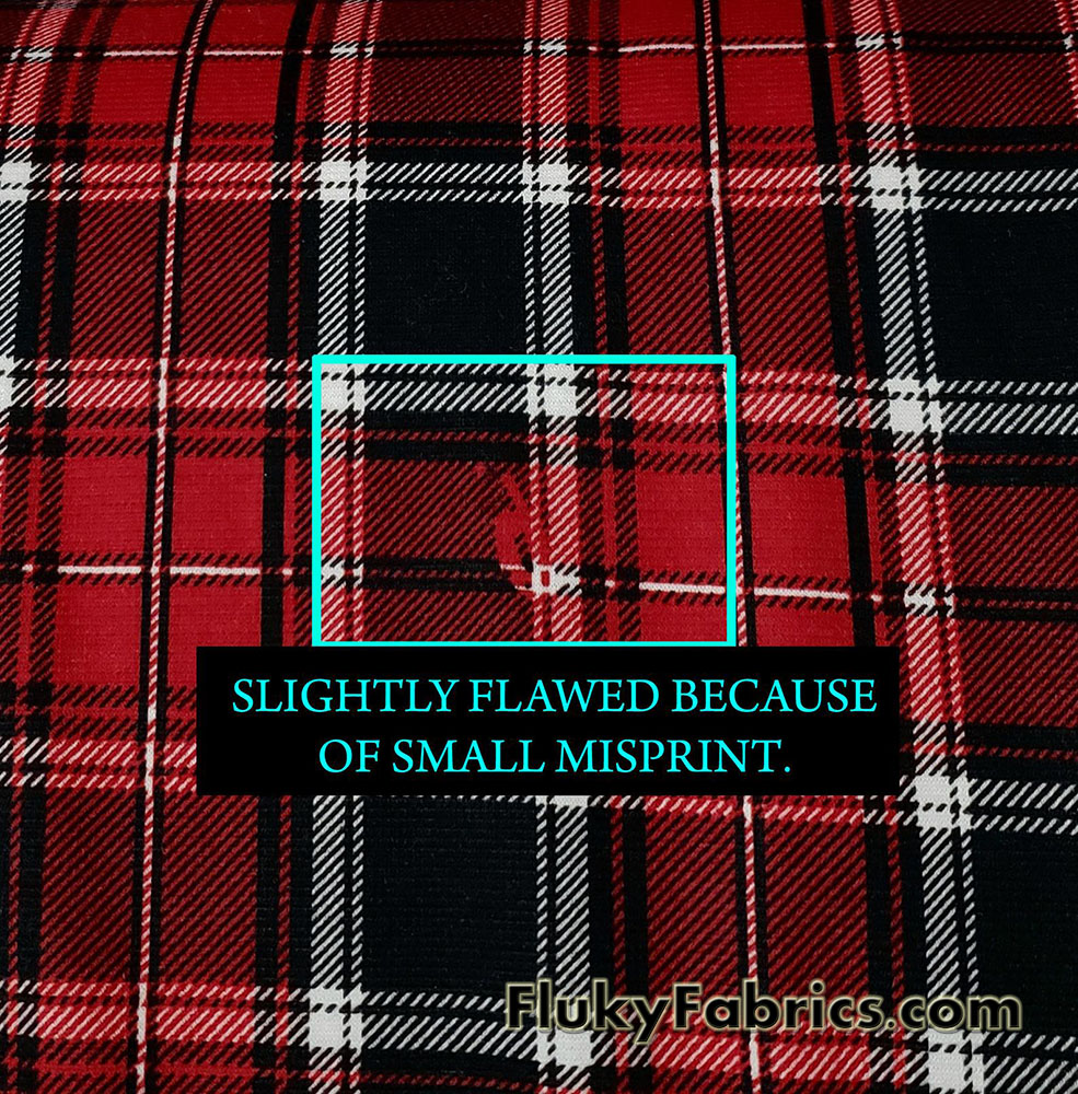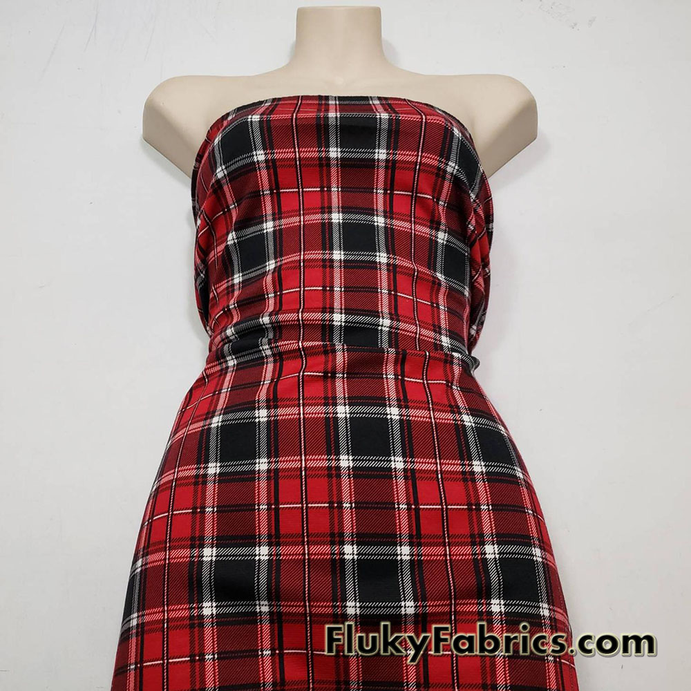 Red, black and white plaid print knit Ponte de Roma fabric.