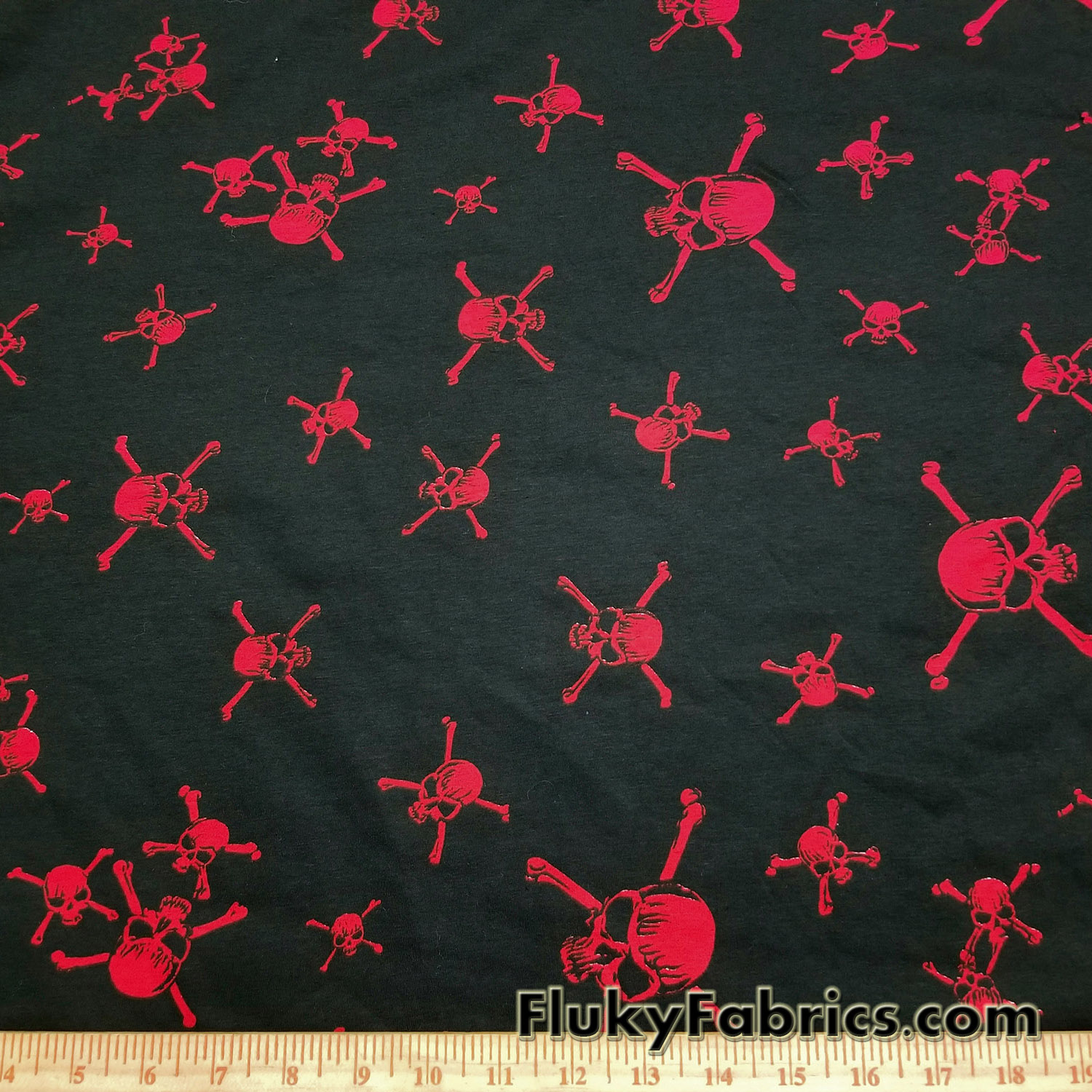 - 4-way stretch cotton lycra with an all over red skulls on black.