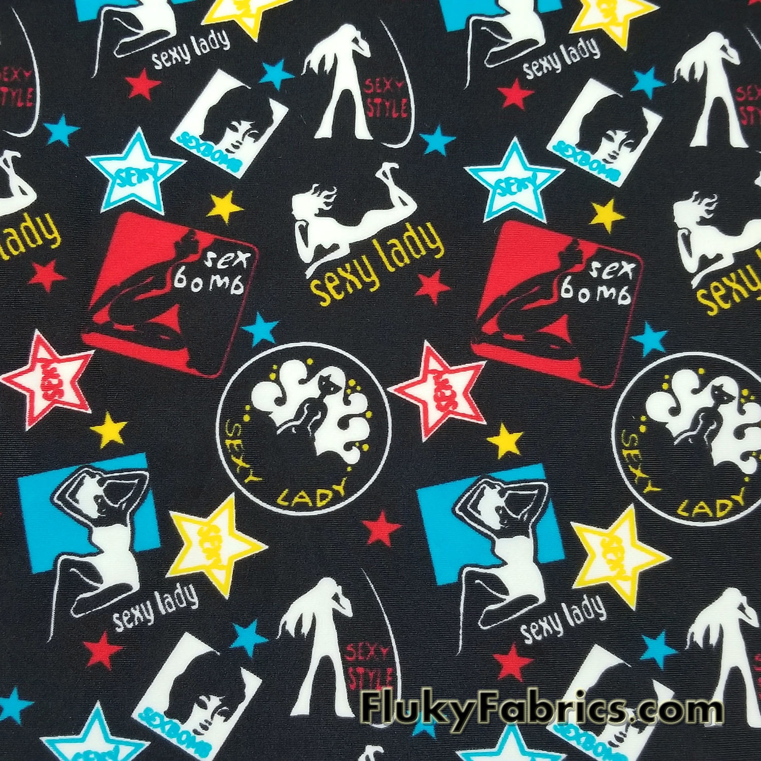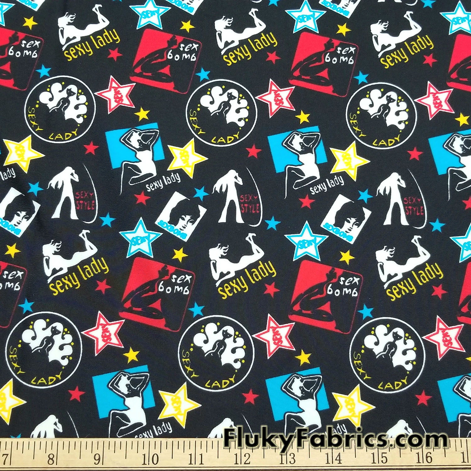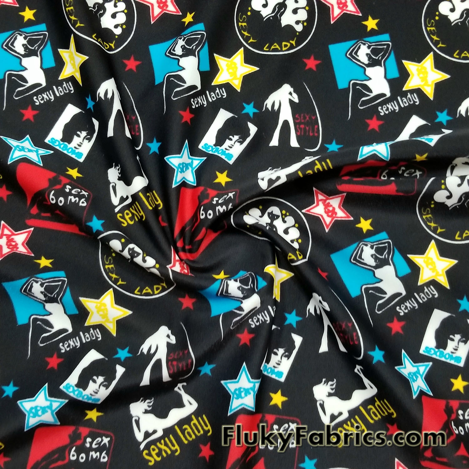 - Sexy lady print over a black background 4-way stretch light to med weight opaque nylon spandex fabric.