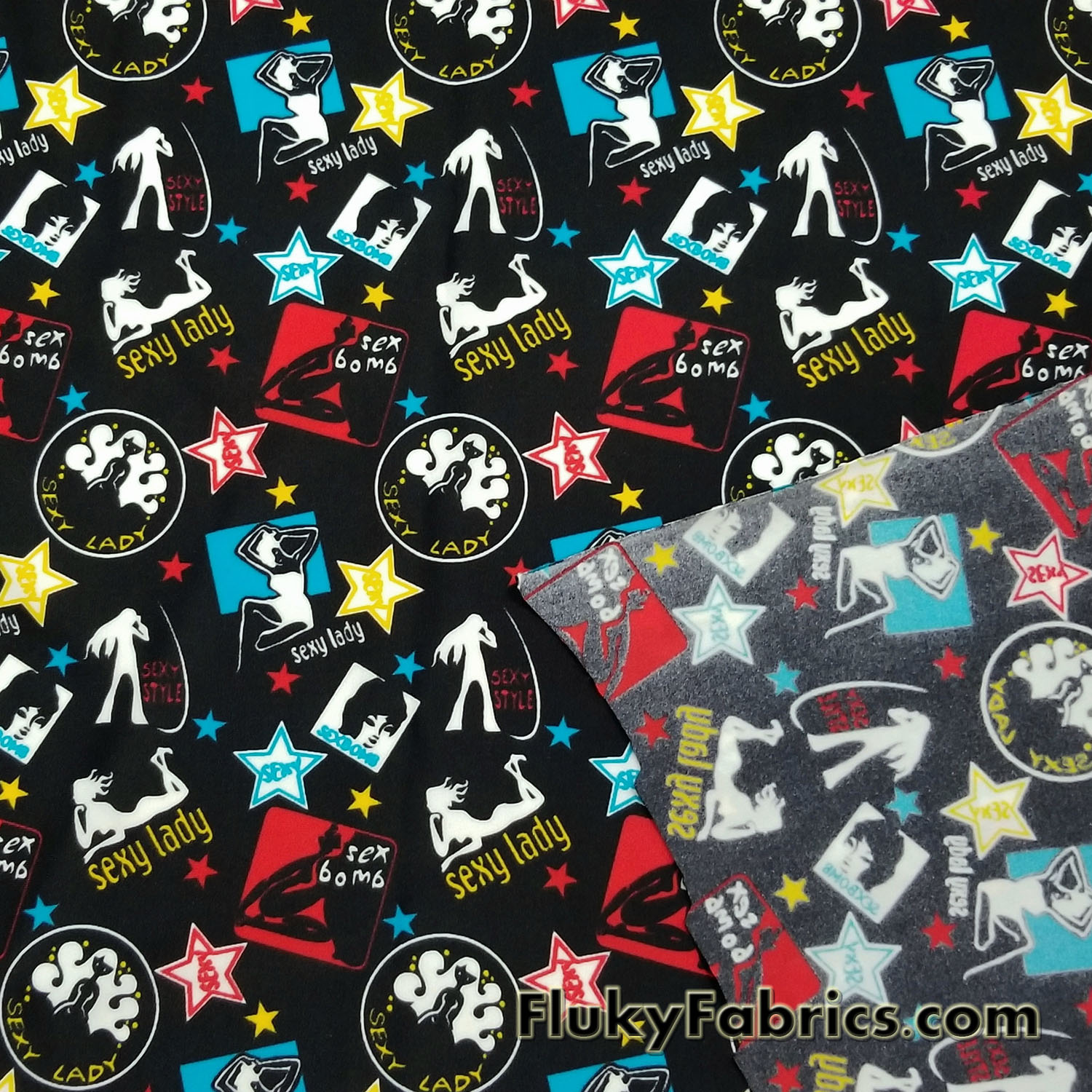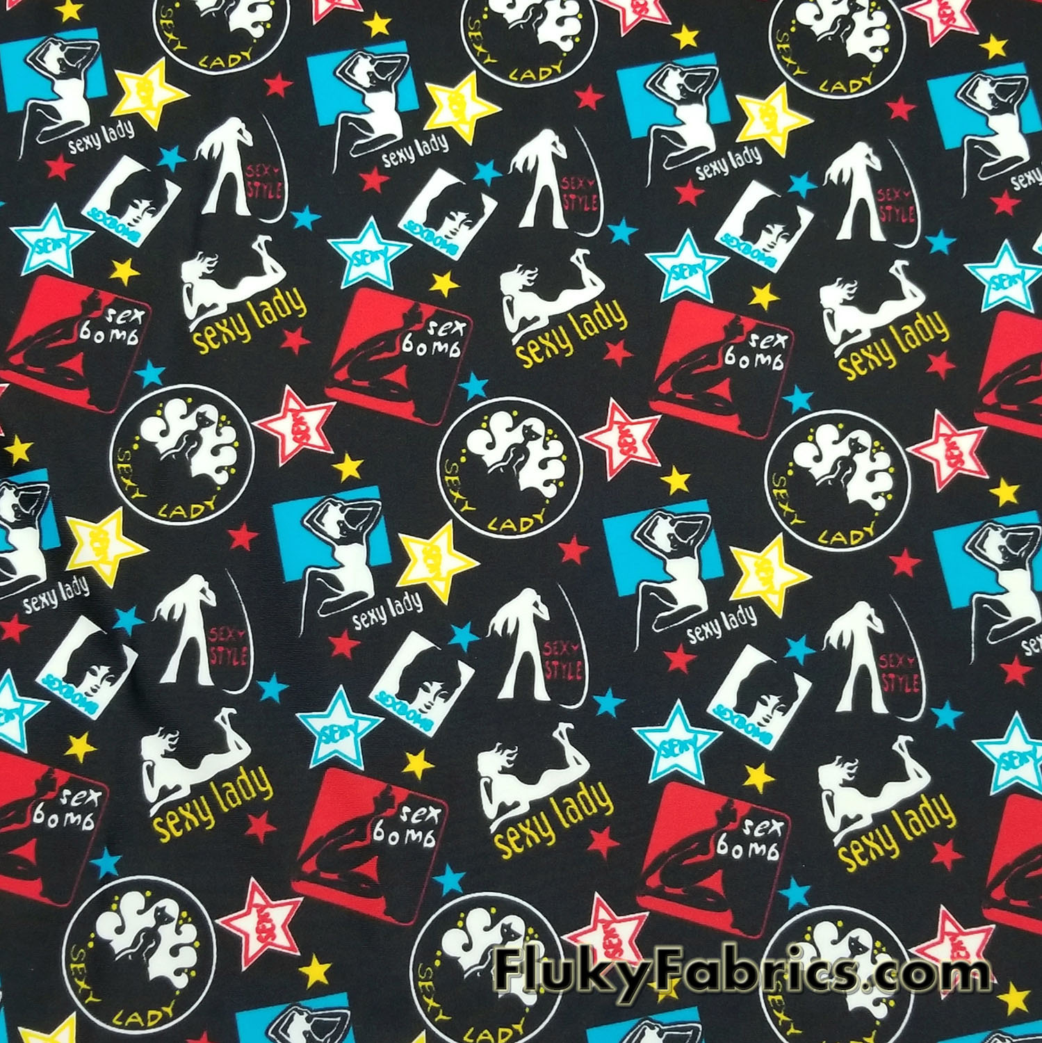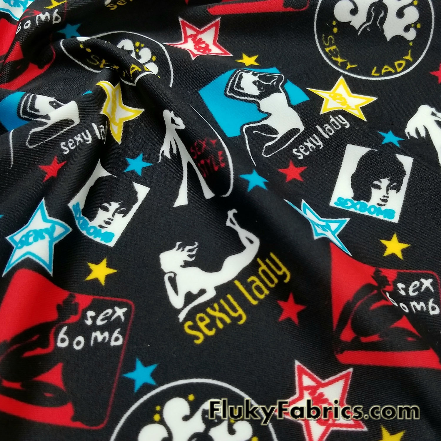 - Sexy lady print over a black background 4-way stretch light to med weight opaque nylon spandex fabric.