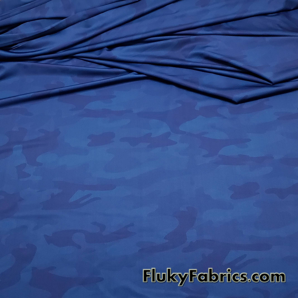 - Beautiful blue camouflage style print 4-way stretch light to med weight opaque nylon spandex fabric.