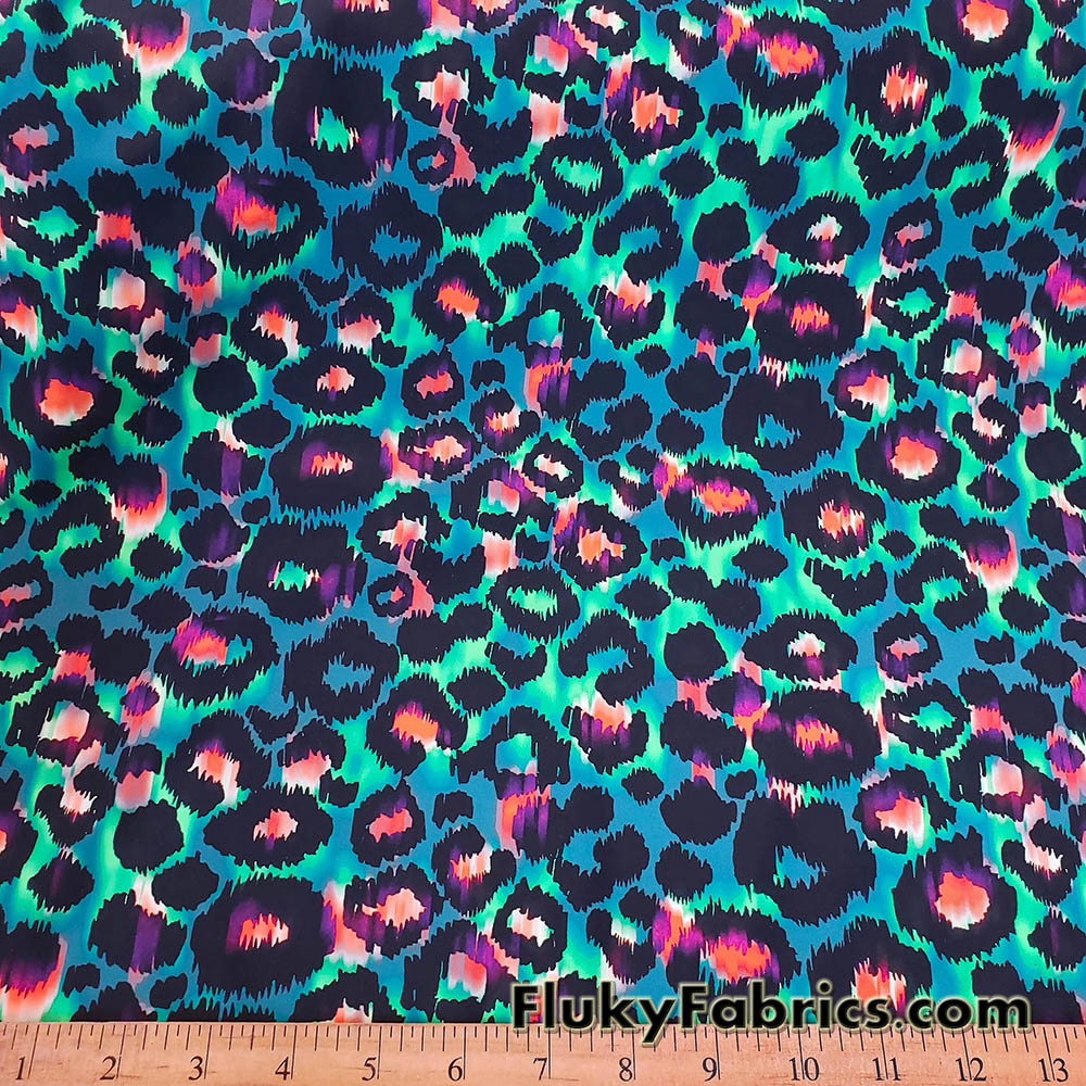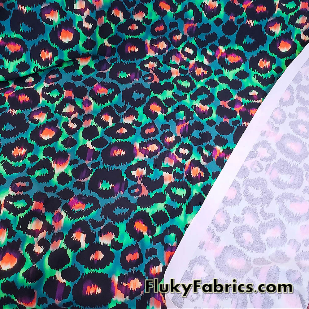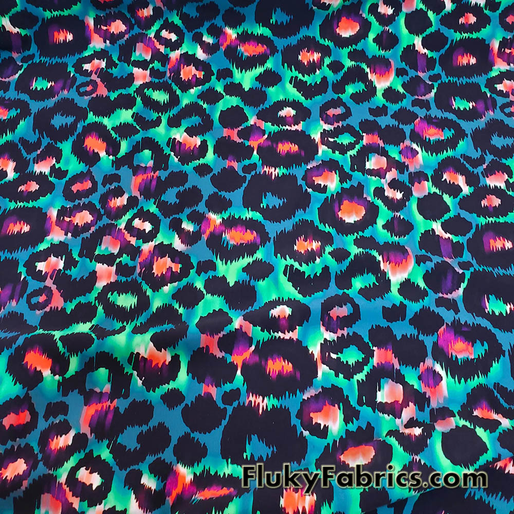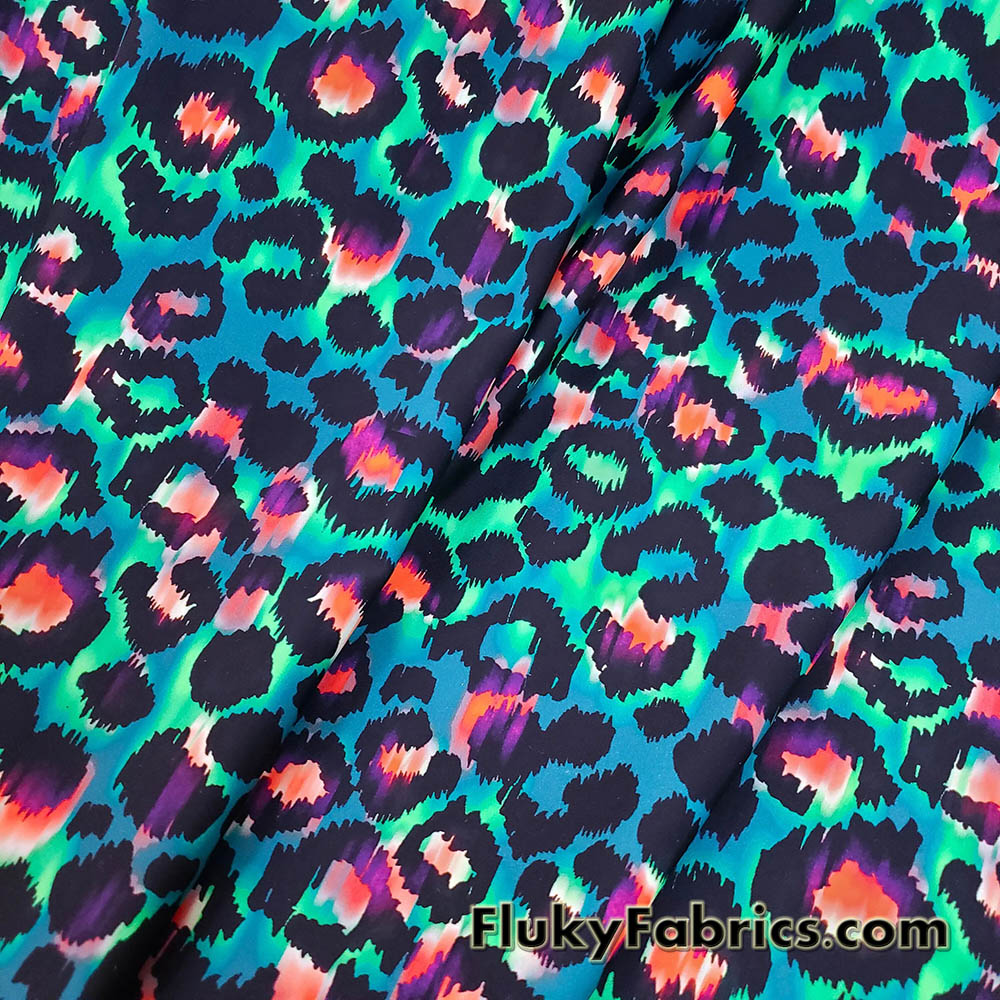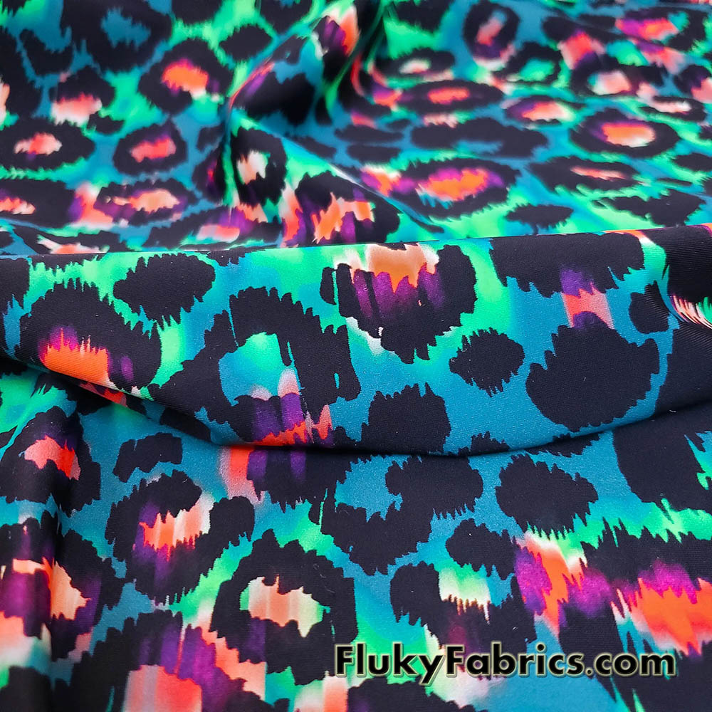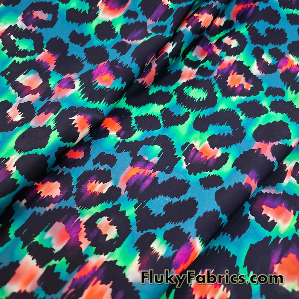 Leopard animal print nylon spandex fabric featuring a striking tie-dye inspired blend of hues including green, purple, pink, orange, and blue over a greenish base. The eye-catching design creates a dynamic, high-energy look perfect for standout pieces.