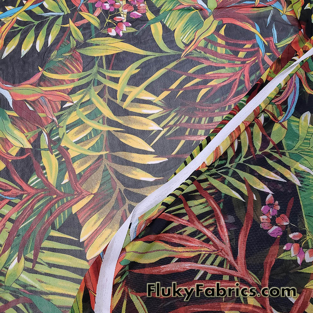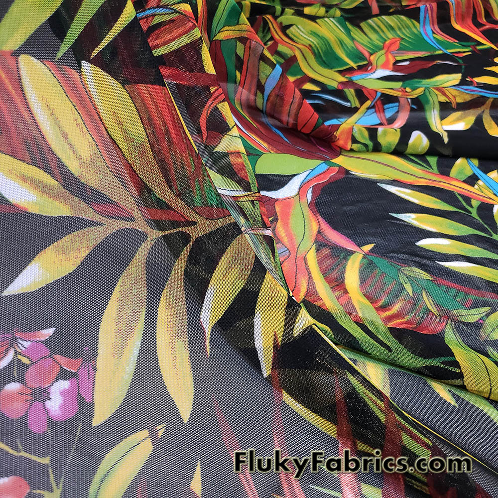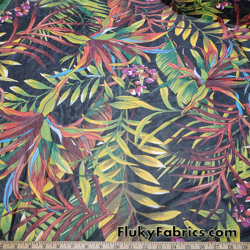 Tropical Floral and Foliage Stretch Mesh Fabric featuring an all-over print of lush tropical leaves and vibrant blooms in rich shades of green, yellow, orange, pink, blue, and brown, this fabric captures the beauty of the tropics with a modern twist.