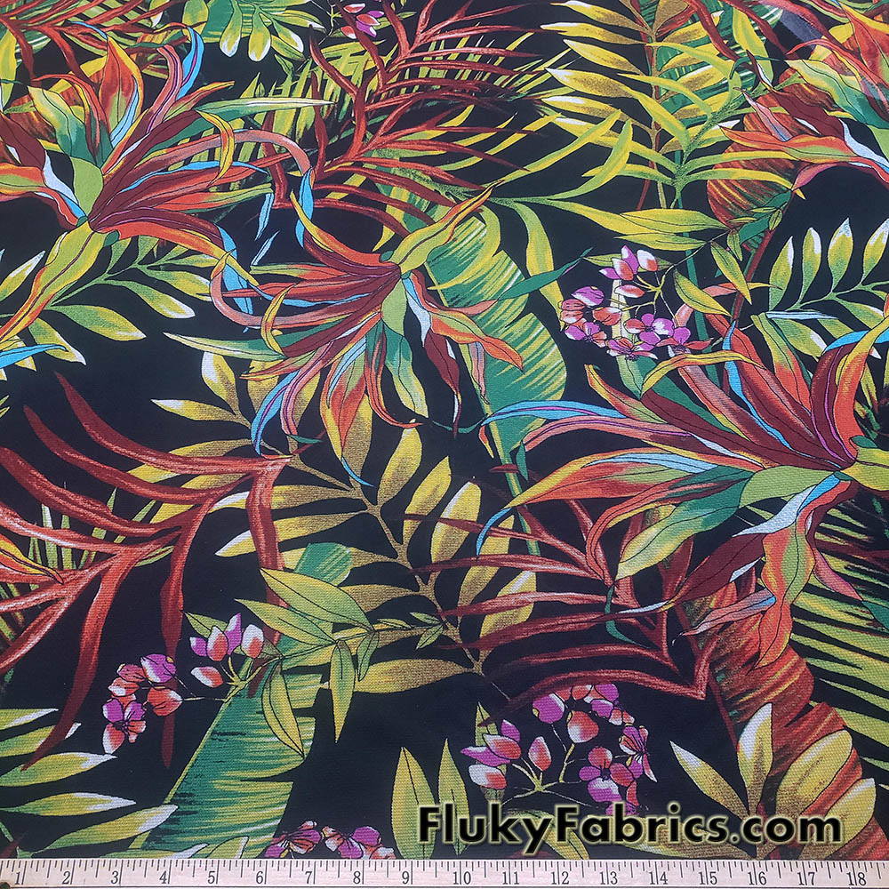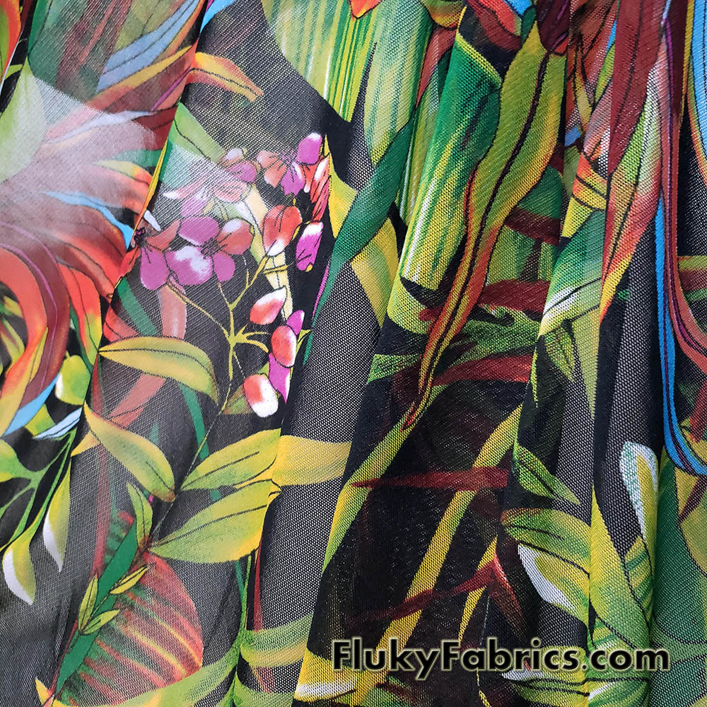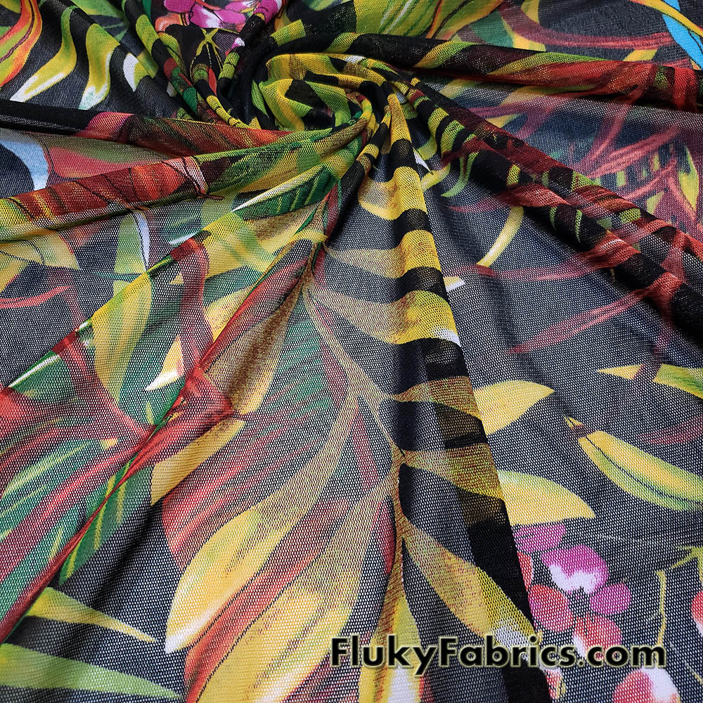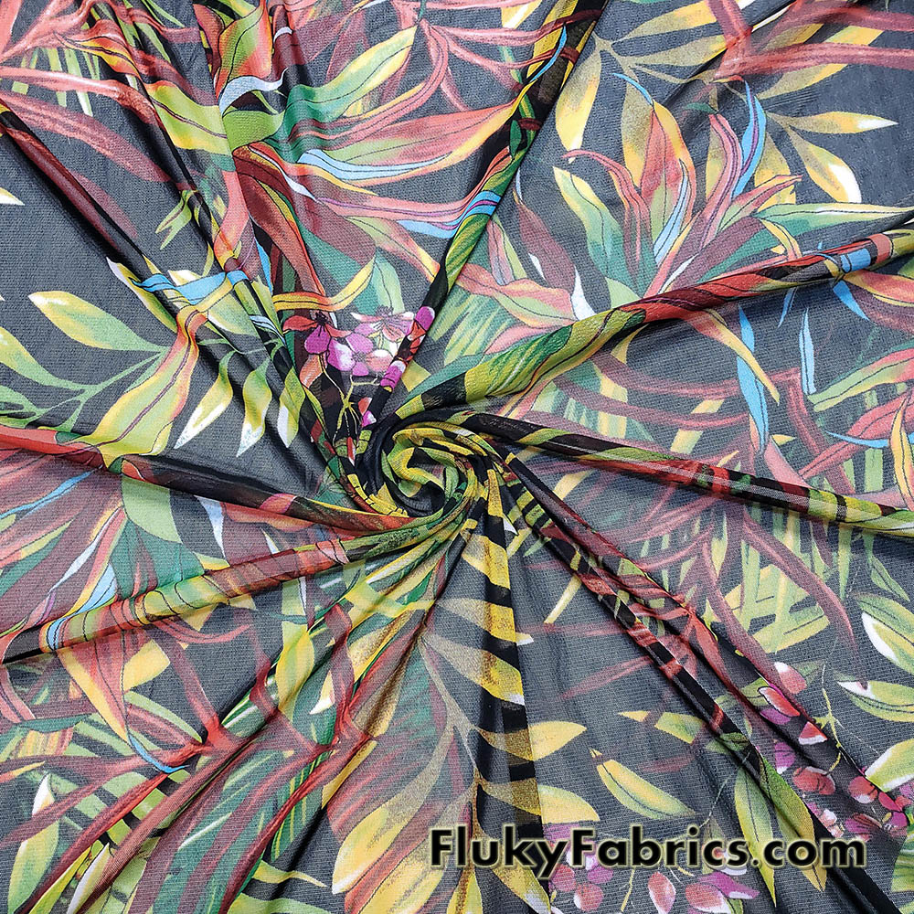Tropical Floral and Foliage Stretch Mesh Fabric featuring an all-over print of lush tropical leaves and vibrant blooms in rich shades of green, yellow, orange, pink, blue, and brown, this fabric captures the beauty of the tropics with a modern twist.