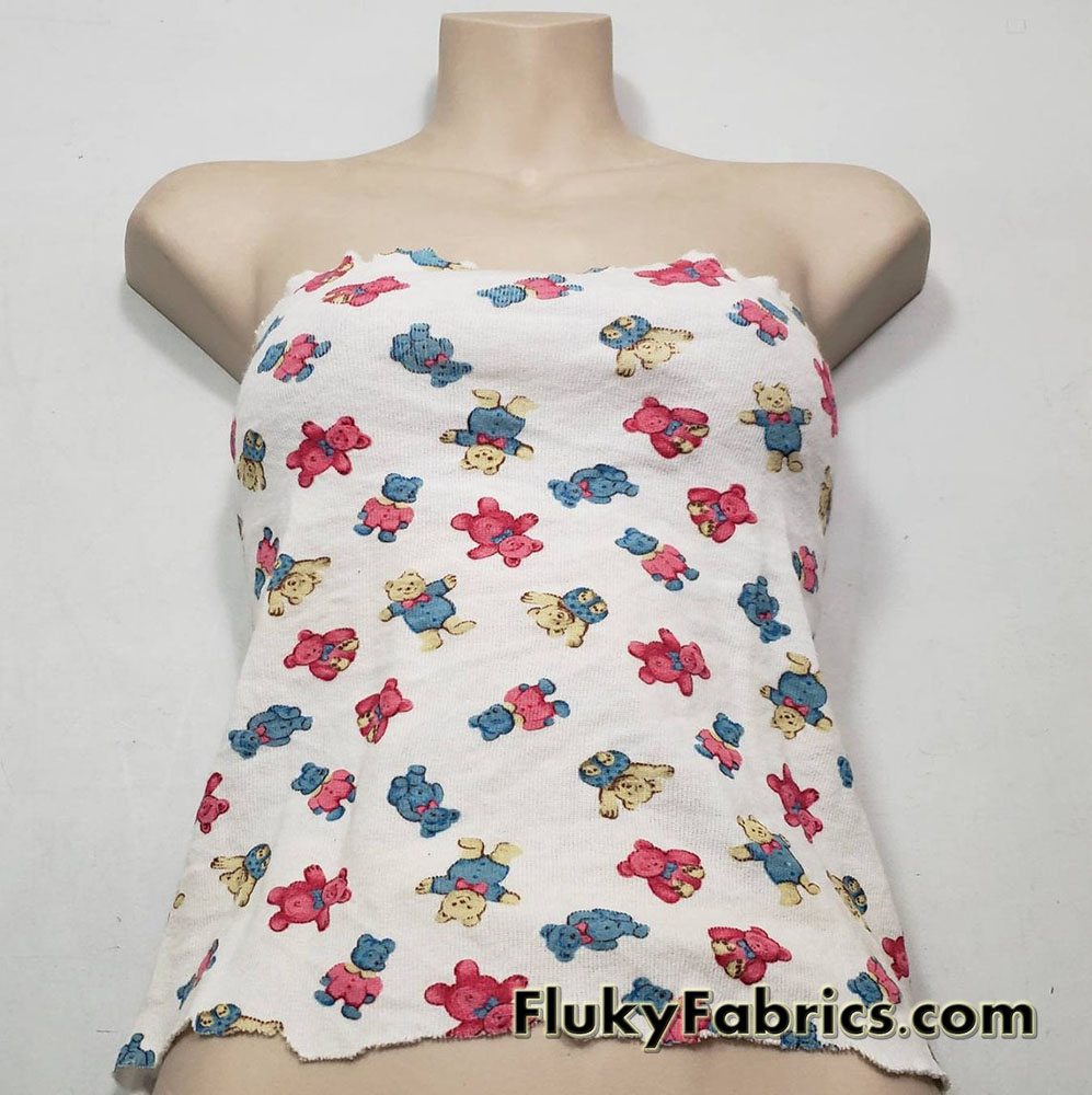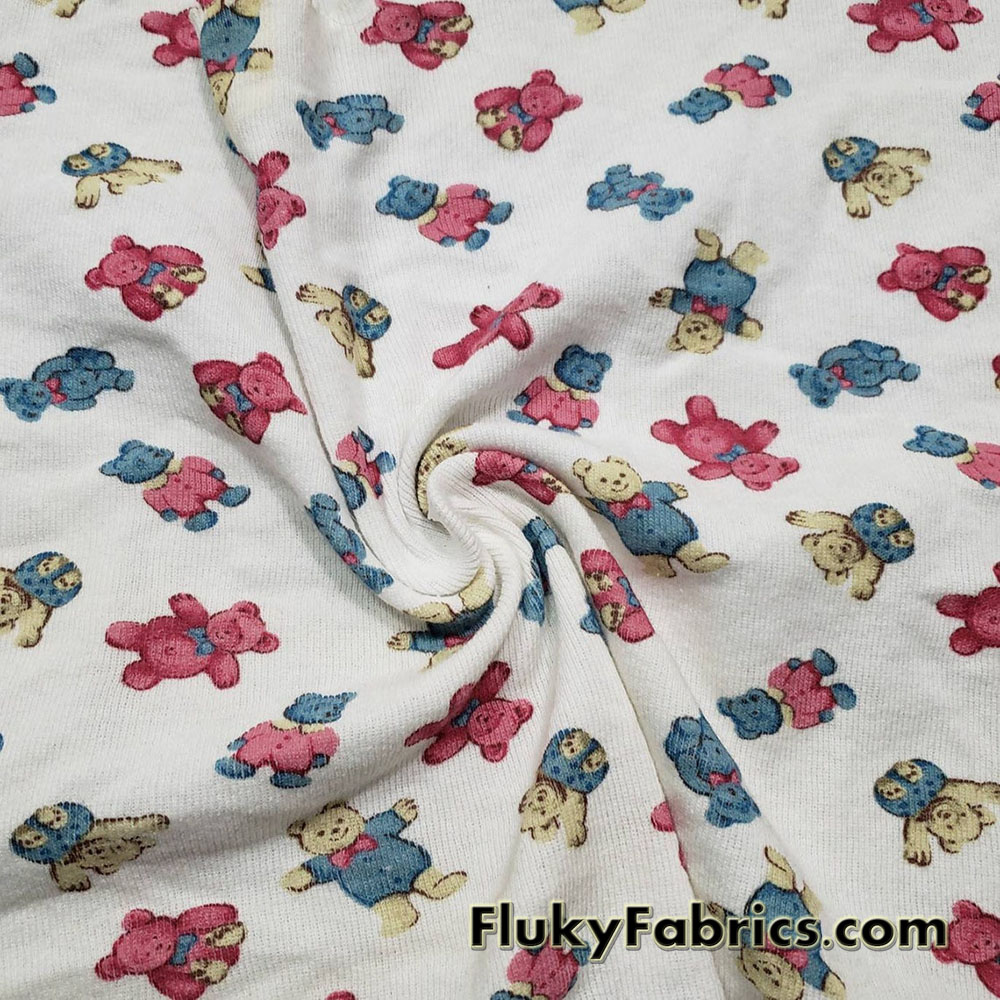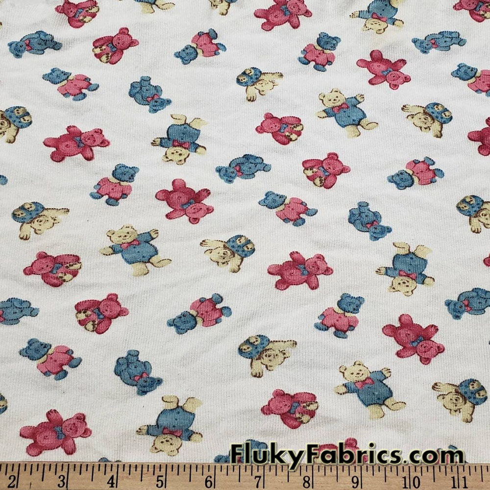 100% cotton open weave rib with a cute print featuring vintage style teddy bears over an off-white background.