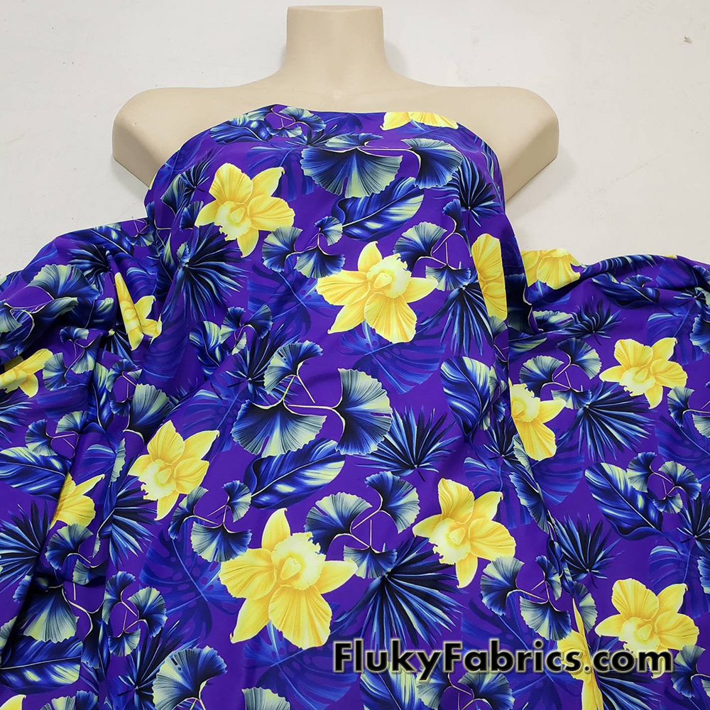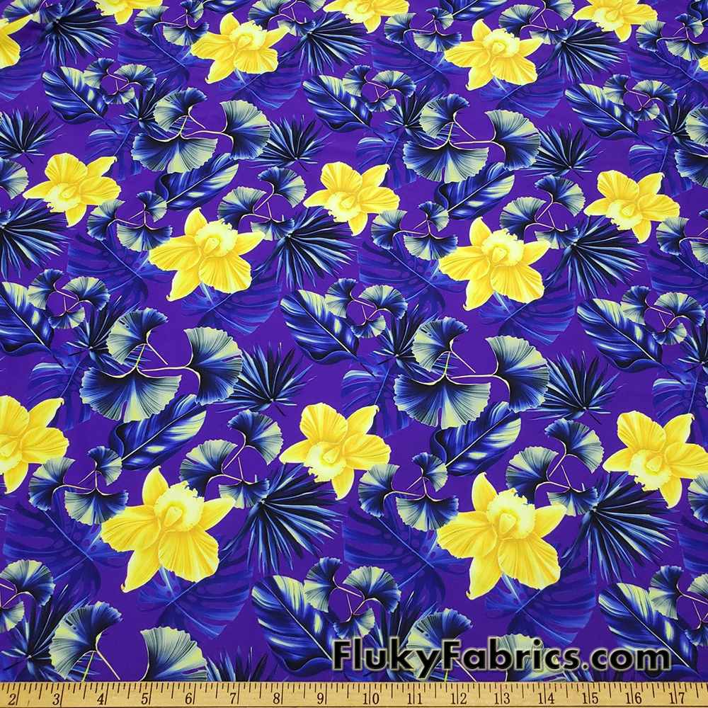 Elevate your creative projects with our UV/Blacklight Reactive Orchids 4-Way Stretch Fabric in a stunning bright yellow orchids and leaves design on a vibrant purple background. This unique and captivating fabric is perfect for adding a touch of magic to your creations.